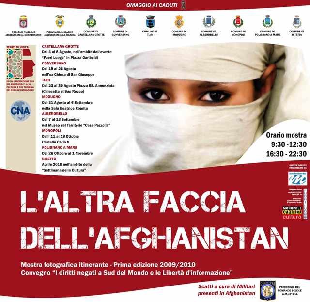 “L’uomo che porta a casa il pane, l’uomo che porta a casa il cibo per sfamare la tribù, quest’uomo diventa il capo famiglia”. Così il Colonnello del Aeronautica Francesco Crocitto durante la conferenza Stampa di presentazione in Provincia, sulla mostra “L’Altra Faccia dell’Afghanistan” ideata e organizzata dalla Cooperativa Edizionimedia, con il patrocinio del Comando Scuole A.M./3a R.A.; della Regione Puglia, Assessorato al Mediterraneo; della Provincia di Bari, Assessorato al Turismo e Cultura; nonché con il patrocinio dei Comuni di Turi, Castellana Grotte, Conversano, Polignano a Mare, Alberobello, Monopoli, Modugno, Bitetto e dei rispettivi assessorati a Cultura e Turismo. Nonché con il contributo CRSEC/Biblioteca civica di Conversano “Maria Marangelli”.
